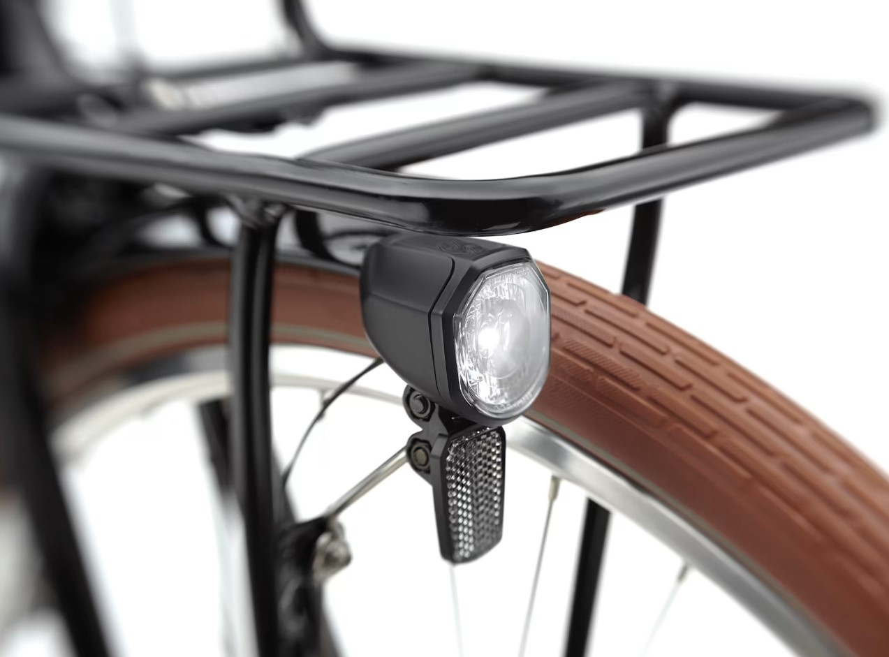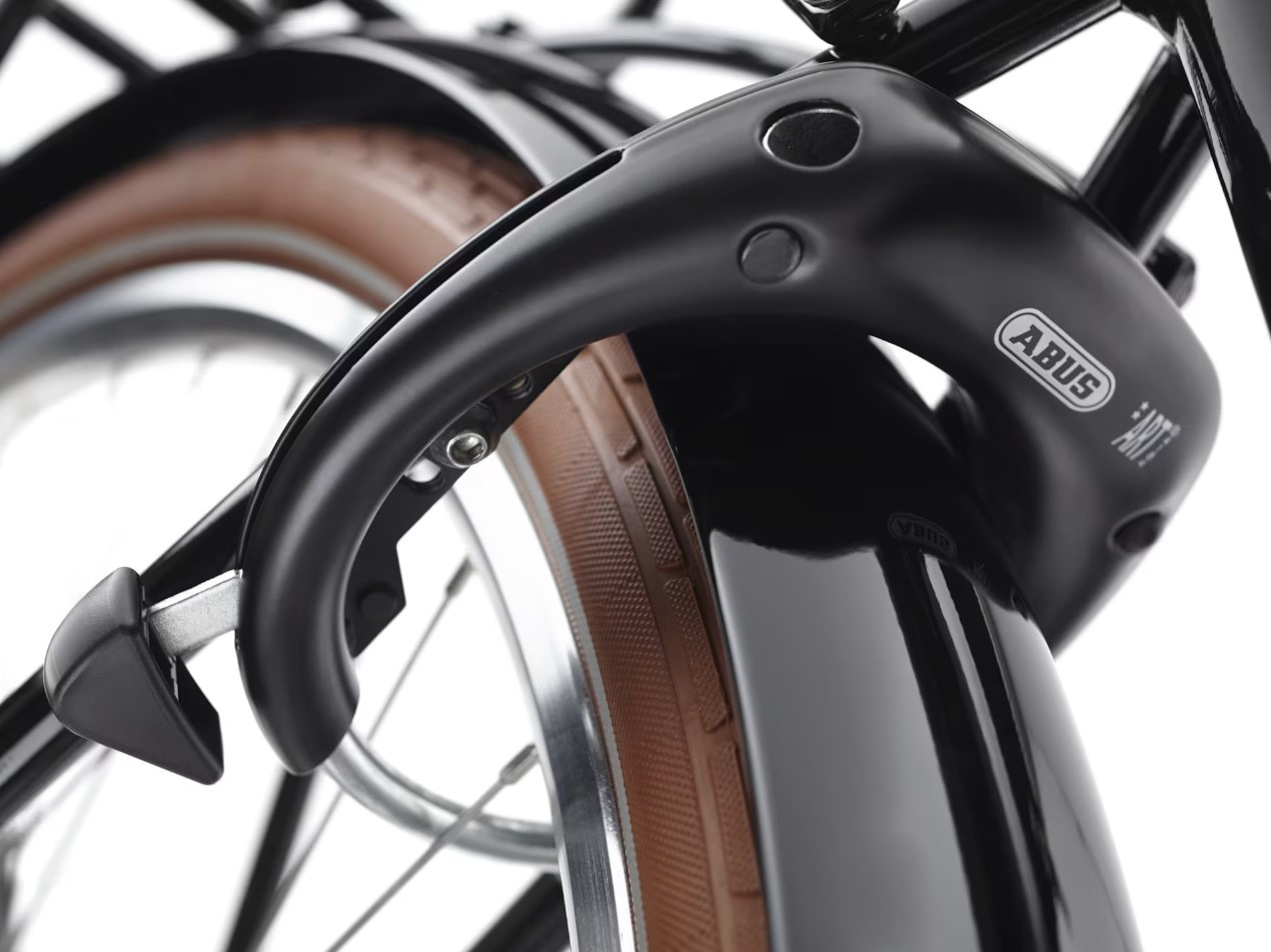 - Blokada ramy ABUS, odblaskowa naklejka na akumulatorze, dzwonek i bagażniki przednie/tylne, malowana osłona łańcucha, wewnętrze prowadzenie linek i przewodów oraz osprzęt ze stali nierdzewnej i zabezpieczony przed korozją