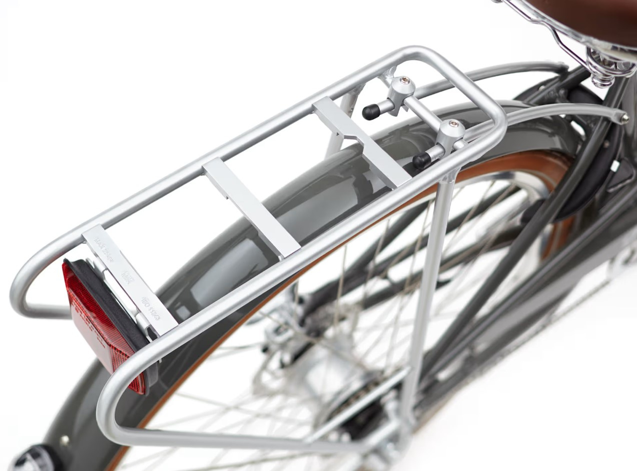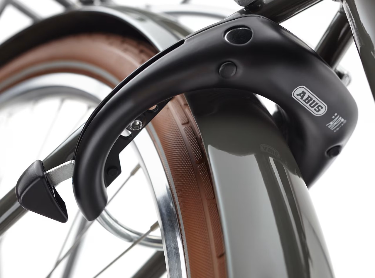 - Blokada ramy ABUS, odblaskowa naklejka na akumulatorze, dzwonek i bagażniki przednie/tylne, malowana osłona łańcucha, wewnętrze prowadzenie linek i przewodów oraz osprzęt ze stali nierdzewnej i zabezpieczony przed korozją