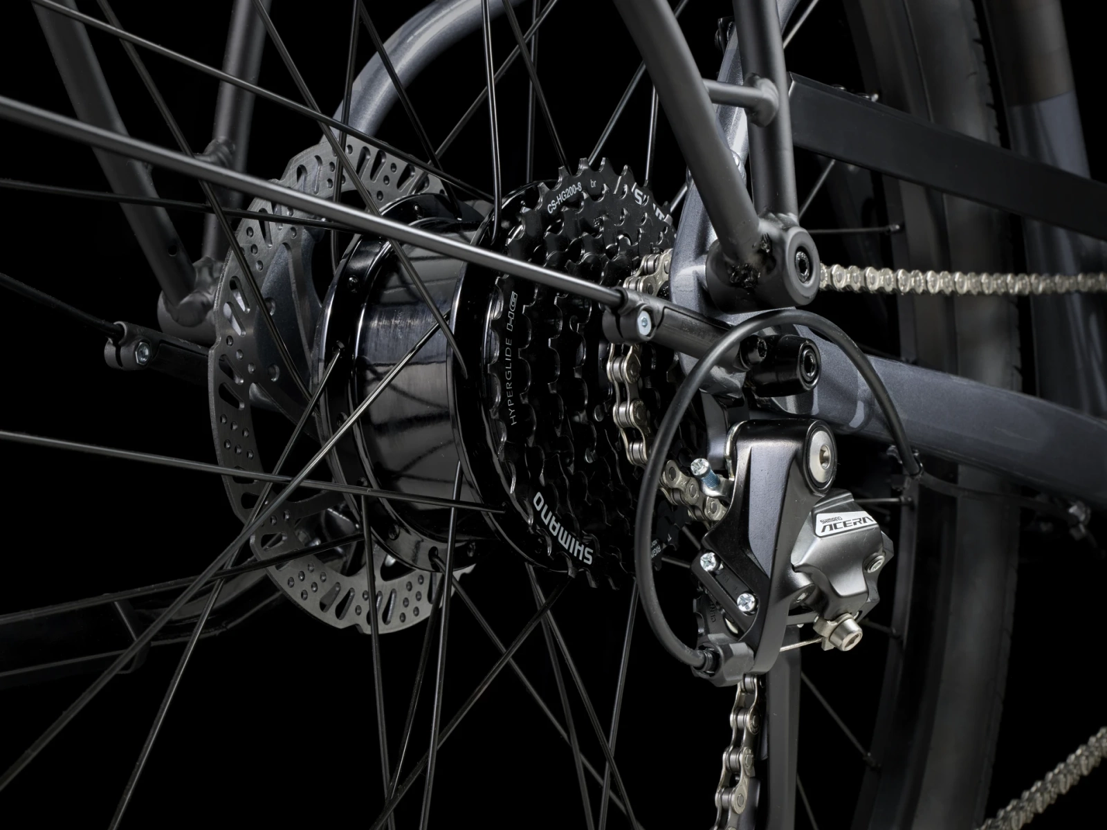 Lekka rama z Alpha Gold Aluminium o geometrii z obniżonym przekrokiem, 8-biegowy napęd Shimano, silnik Hyena (250 W, 40 Nm) utrzymujący prędkość do 25 km/h, kontroler LED z Bluetooth oraz akumulator o pojemności 250 Wh. Do tego, hydrauliczne hamulce tarczowe, regulowany wspornik kierownicy Bontrager zgodny z Blendr, szerokie opony 27,5” x 2” dające stabilność i przyczepność, ergonomiczne chwyty, lampki, bagażnik zgodny z systemem MIK i zapięcie.