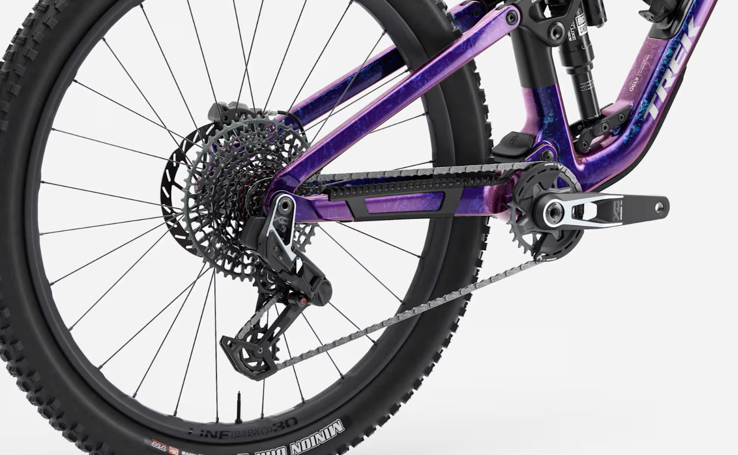 Bontrager Line Pro 30, z włókna węglowego OCLV Mountain, obręcz przystosowana do zastosowania bezdętkowego, piasta Rapid Drive 108, tarcza na 6 śrub, bębenek piasty Shimano MicroSpline, Boost148, sztywna oś przelotowa 12 mm, 29”