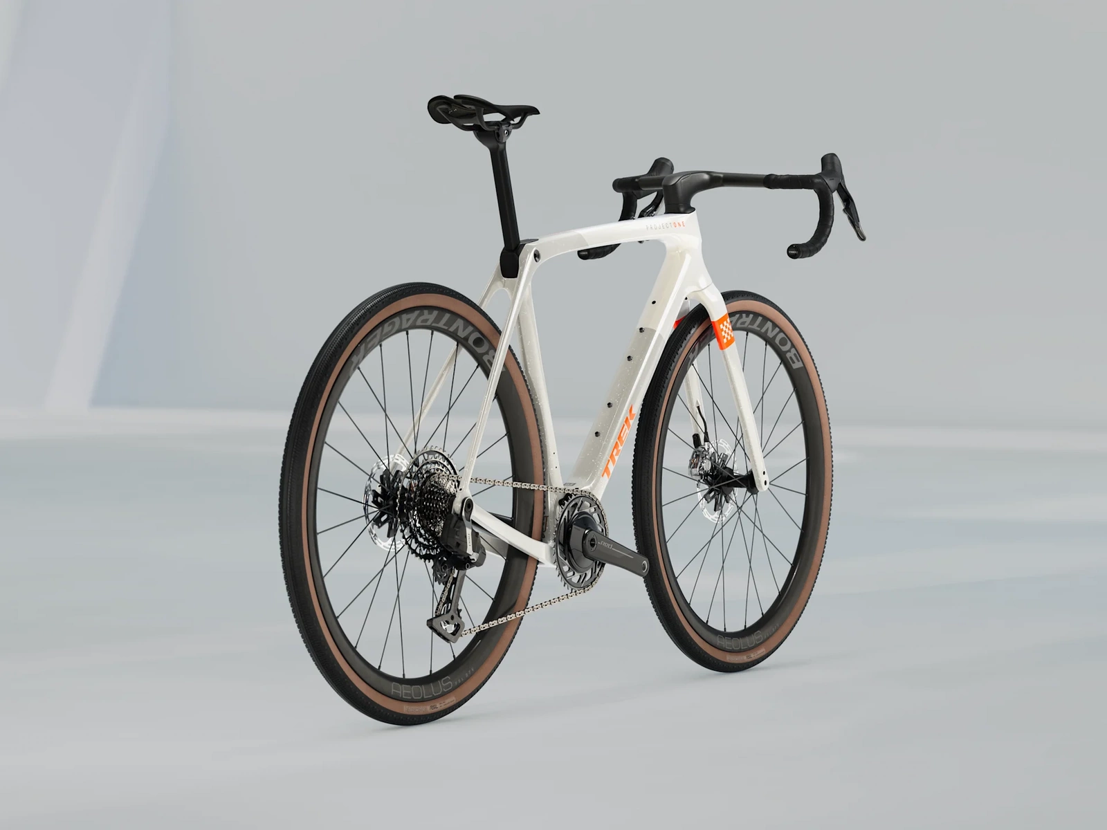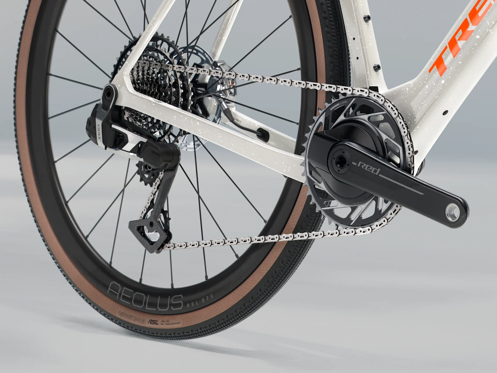 Lekka i aerodynamiczna rama z włókna węglowego OCLV serii 800 z komfortową technologią IsoSpeed oraz mnóstwem mocowań, by zabrać to, co potrzebne na wyścig. Koła z włókna węglowego Bontrager Aeolus RSL 37V oraz karbonowa kierownica z mostkiem Trek Aero RSL zapewniają lekkość i zwinność. Do tego jeszcze dodaliśmy najlżejszy i najbardziej ergonomiczny napęd SRAM RED XPLR AXS z bezprzewodowym przerzucaniem, stworzony na trudniejsze trasy.