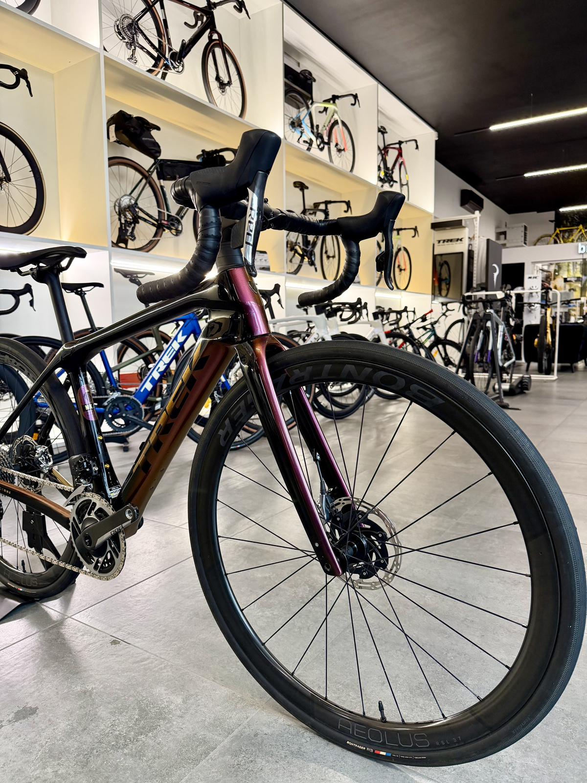- Domane SLR z włókna węglowego, zwężana rura sterowa z włókna węglowego, wewnętrzne prowadzenie przewodów hamulca, mocowania błotników, hamulce tarczowe flat mount, haki z włókna węglowego, oś przelotowa 12 x 100 mm