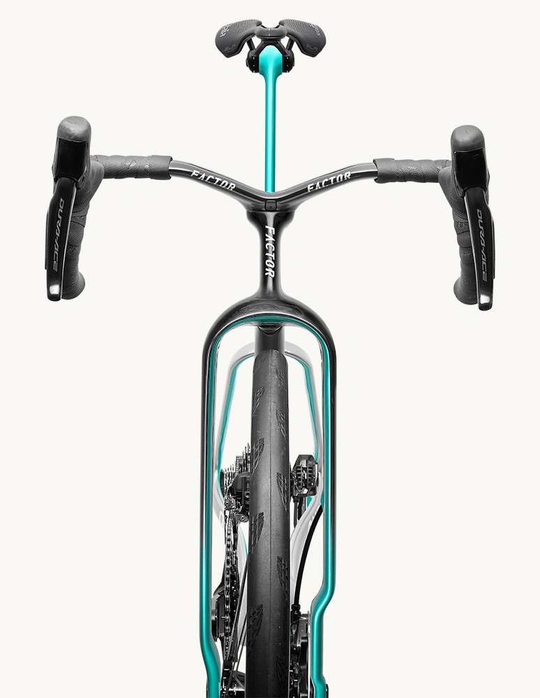 Factor ONE prezentuje zupełnie nowe spojrzenie na projektowanie współczesnych rowerów wyścigowych. Kolarstwo najwyższego szczebla ewoluowało: zawodnicy siedzą bardziej z przodu, używają węższych kierownic, krótszych korb, szerszych opon i przyjmują bardziej aerodynamiczne pozycje niż kiedykolwiek wcześniej. ONE projektowano pod te realia od pierwszego szkicu – a nie dopasowywano do nich post factum.