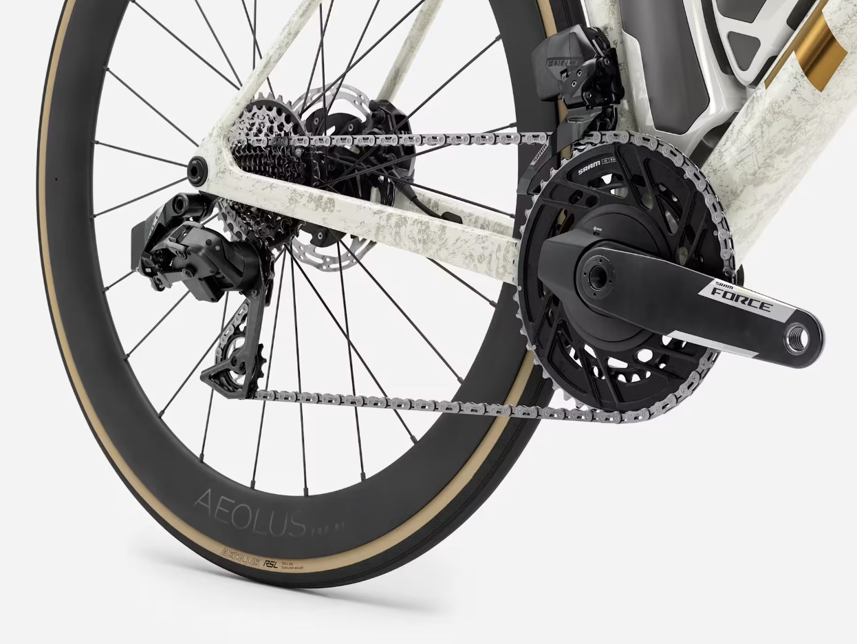 Rama z widelcem | Włókno węglowe OCLV Serii 900, kształty rur Full System Foil, rura podsiodłowa IsoFlow, system sterów RCS, prowadzenie przewodów przystosowane wyłącznie do elektronicznych, aerodynamiczna prowadnica łańcucha z możliwością demontażu, suport T47, hamulce tarczowe flat mount, uniwersalny hak przerzutki UDH, sztywna oś przelotowa 142x12 mm |