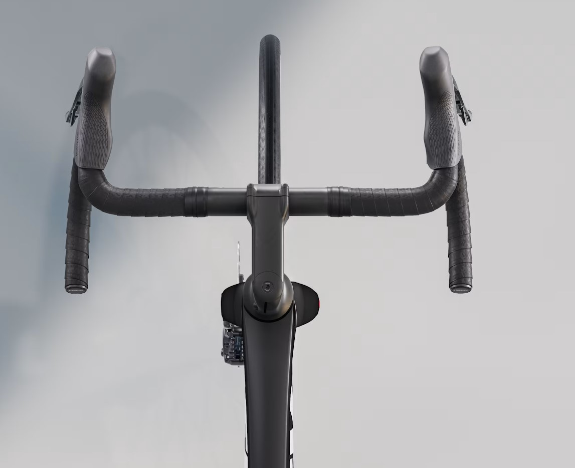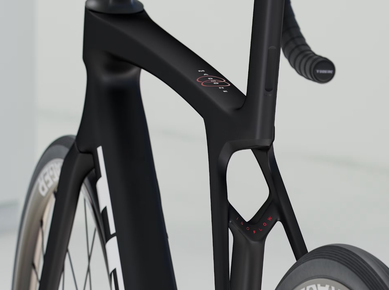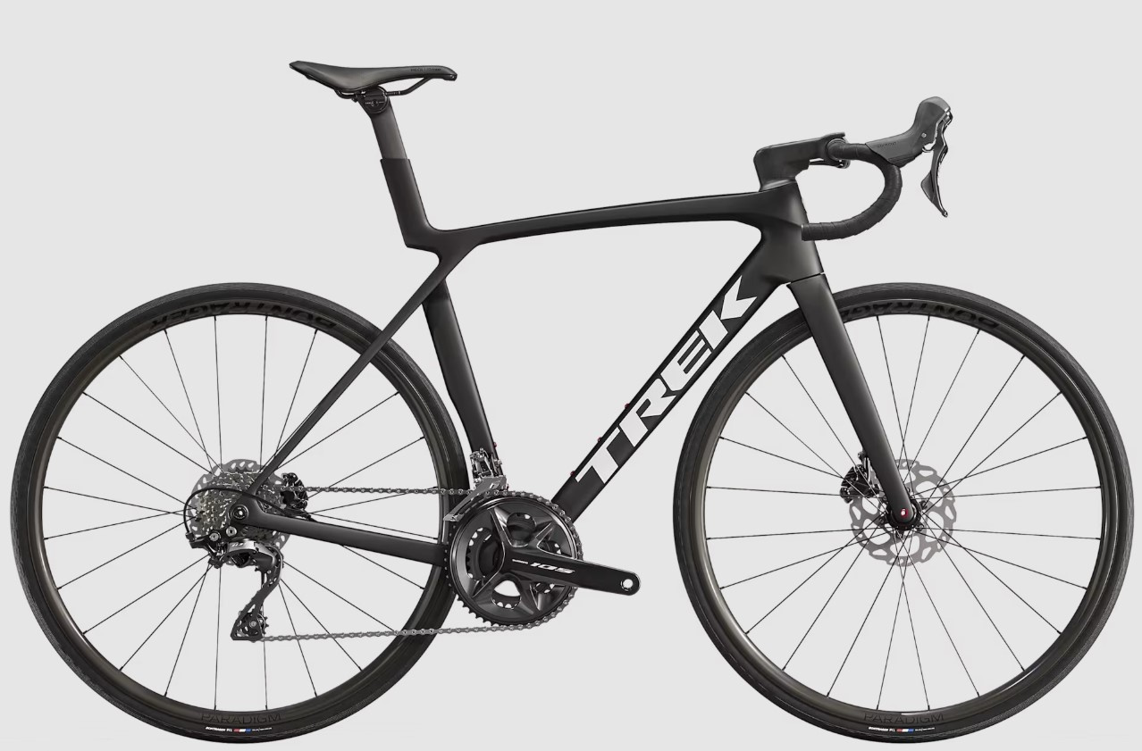 - Madone Gen 8 full carbon, tapered carbon steerer, internal brake routing, flat mount disc, 12x100mm chamfered thru axle