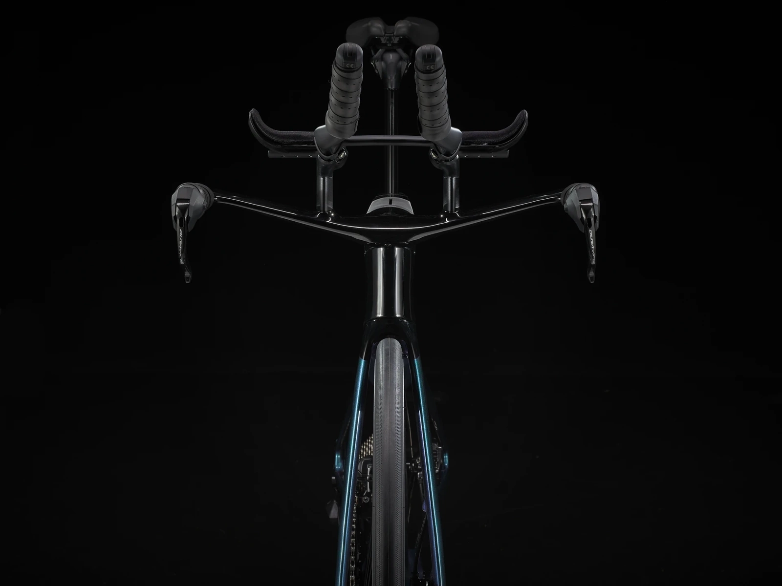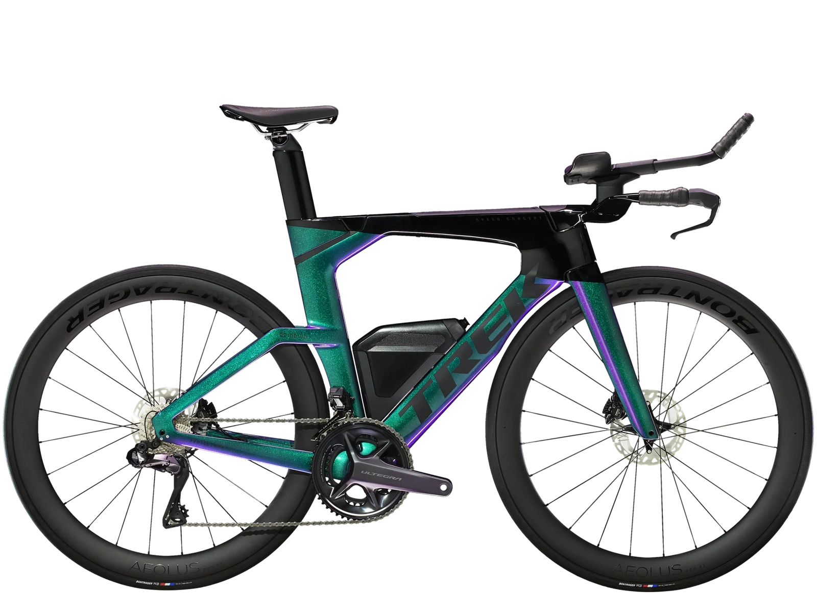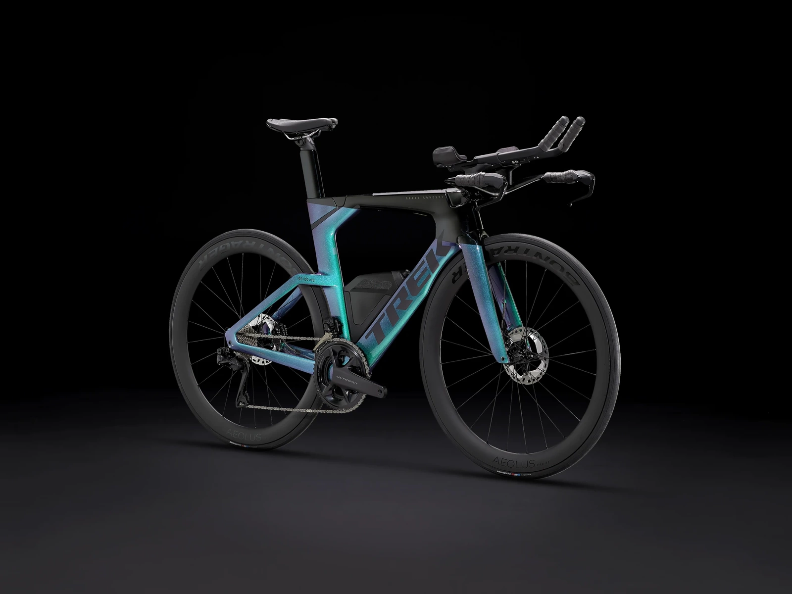 Superlekka rama z włókna węglowego OCLV Serii 800, ograniczające opory powietrza kształty rur Kammtail Virtual Foil (KVF), aerodynamiczny karbonowy widelec Speed Concept, wygładzający drogę rozdzielacz IsoSpeed, wbudowany schowek na przekąski, napoje i zestaw naprawczy, sterowany bezprzewodowo 12-rzędowy napęd Shimano Dura-Ace/Ultegra Di2, w pełni zintegrowana z mostkiem kierownica, siodełko triatlonowe Bontrager Hilo Comp dla odpowiednio agresywnej pozycji aerodynamicznej, niezawodne hamulce tarczowe i koła z włókna węglowego OCLV Bontrager Aeolus Pro 51.