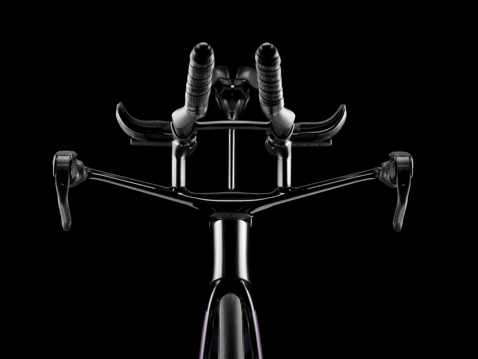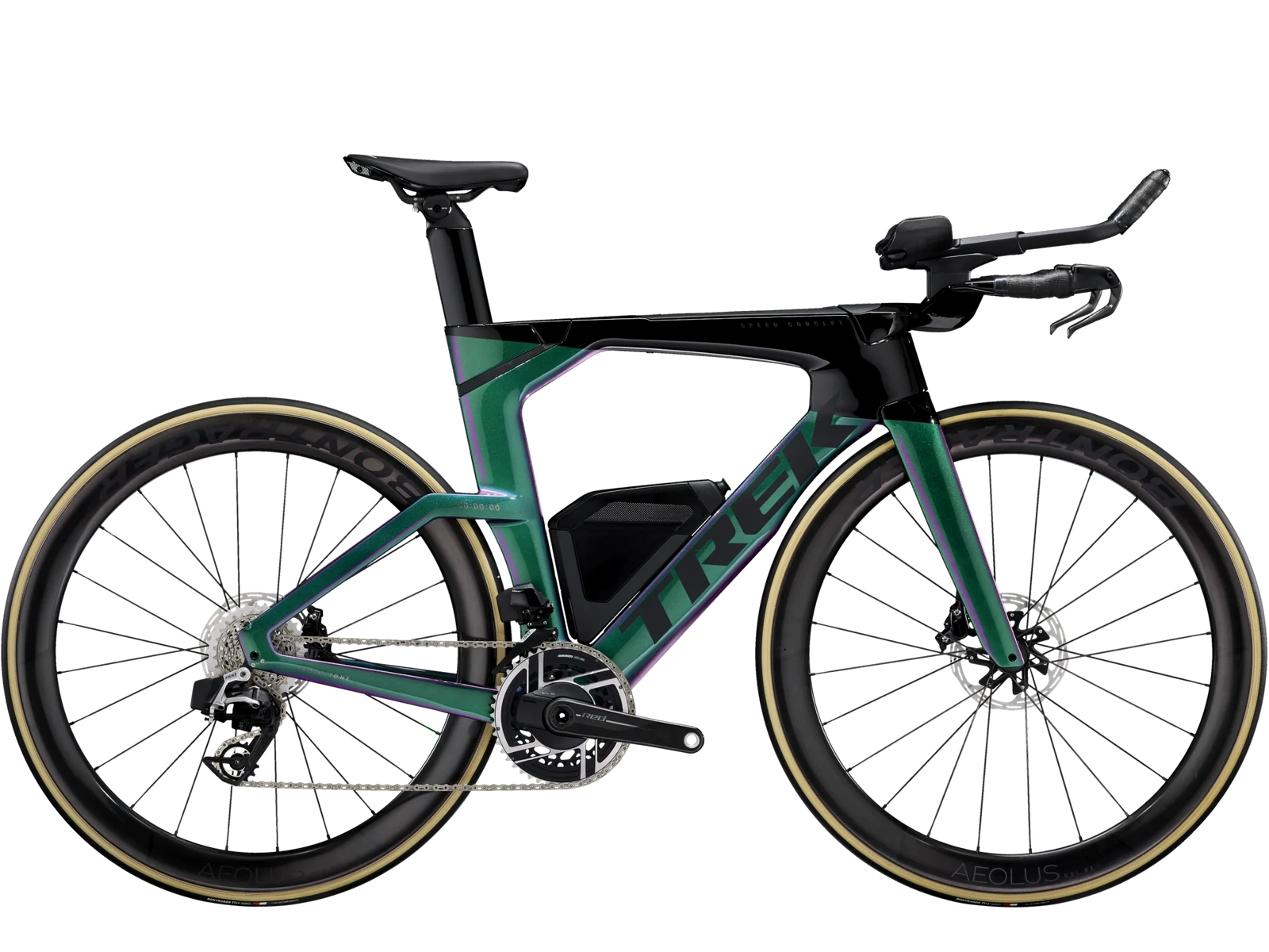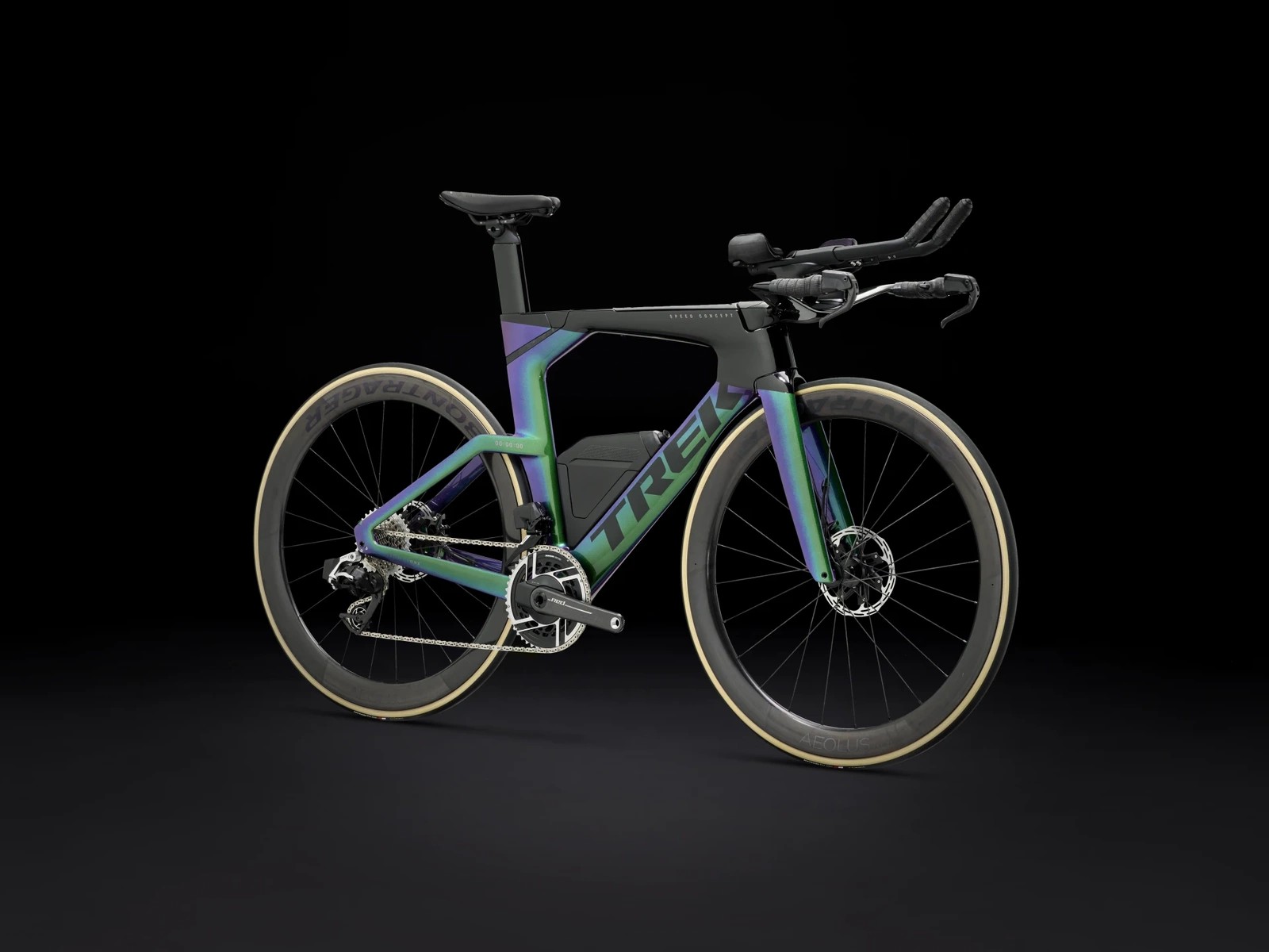 Superlekka rama z włókna węglowego OCLV Serii 800, ograniczające opory powietrza kształty rur Kammtail Virtual Foil (KVF), aerodynamiczny karbonowy widelec Speed Concept, wygładzający drogę rozdzielacz IsoSpeed, wbudowany schowek na przekąski, napoje i zestaw naprawczy, sterowany bezprzewodowo 12-biegowy napęd SRAM RED AXS z manetkami SRAM AXS Blips, miernik mocy RED AXS, w pełni zintegrowana z mostkiem kierownica, siodełko triathlonowe Bontrager Hilo Pro Carbon dla odpowiednio agresywnej pozycji aerodynamicznej, niezawodne hamulce tarczowe i aerodynamiczne koła z włókna węglowego OCLV Bontrager Aeolus RSL 51.